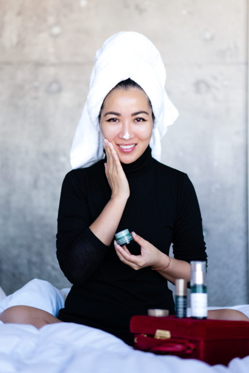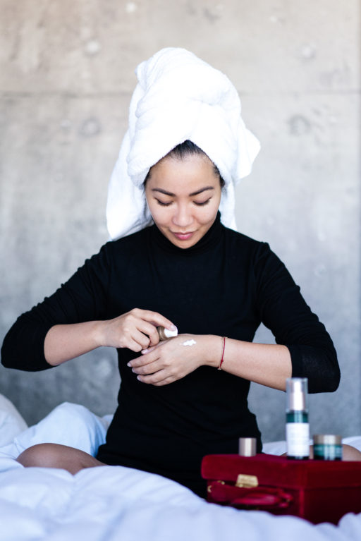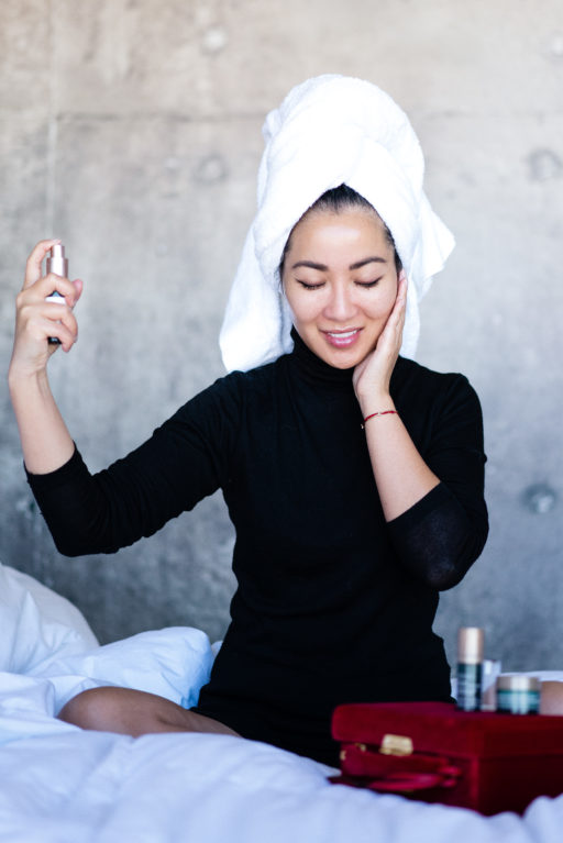 For travel and home, for every morning and night, I put on the serum after washing my face. Then, the cream. I love this cream for colder months. Then afterwards, I quick spray of the mist. And another spray of the mist on my makeup sponge right before dabbing the sponge onto my foundation.