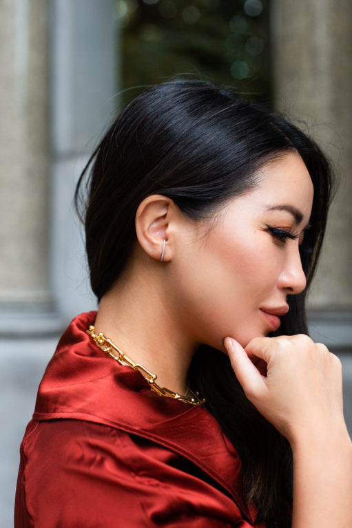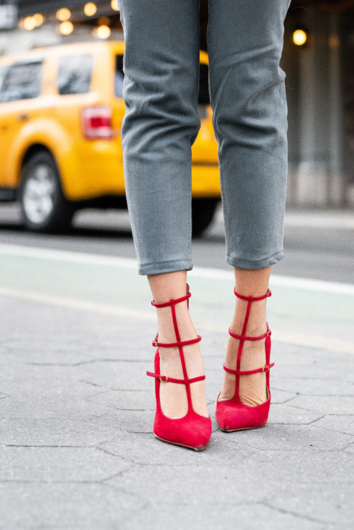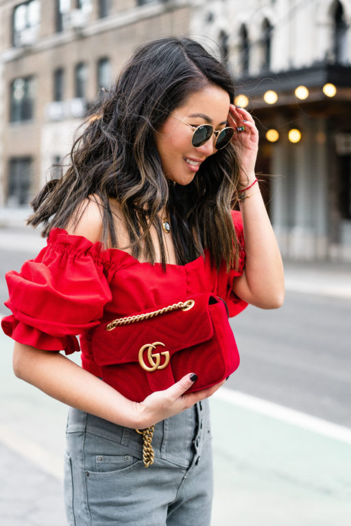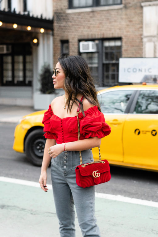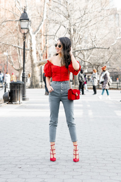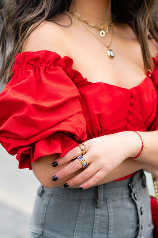 The vibrant red color, the mini buttons, the dramatic sleeves, this top embodies the spirit of spring! I love that you can wear the sleeves on or off shoulder. I wanted to create a full color story, so I paired with top with red accessories. An almost all red look for spring!