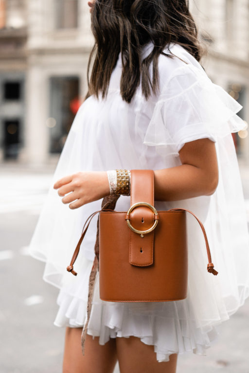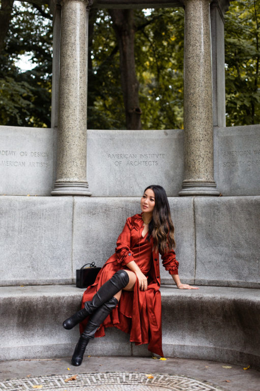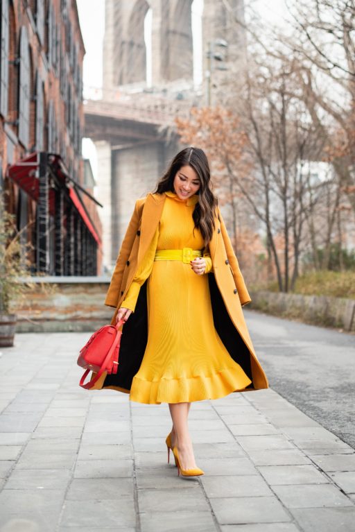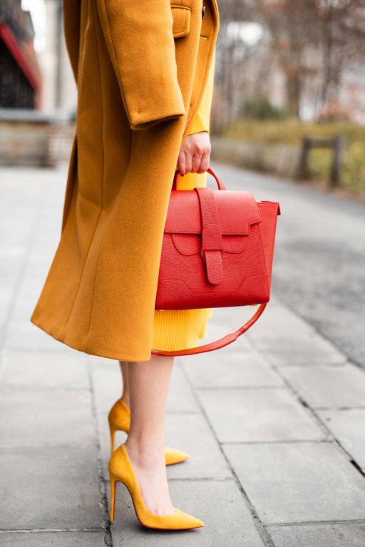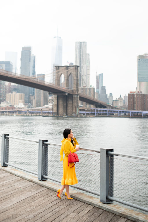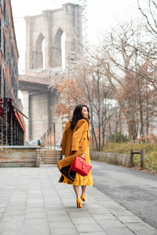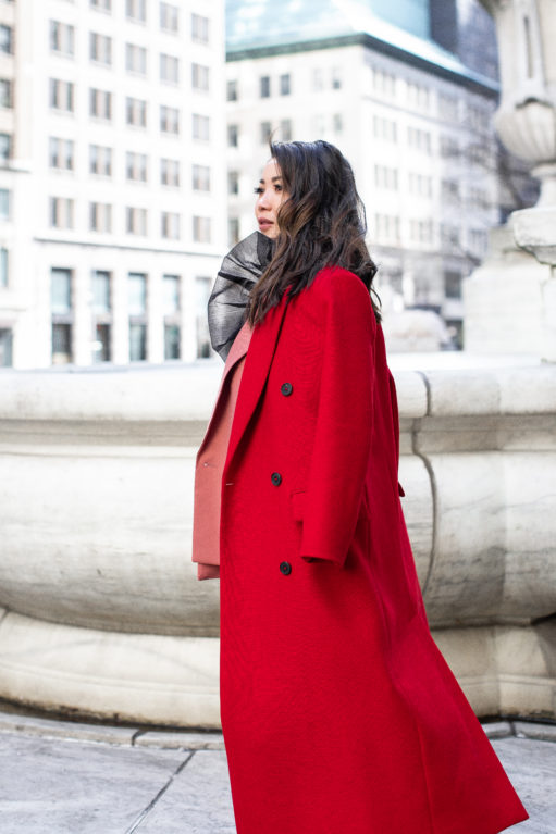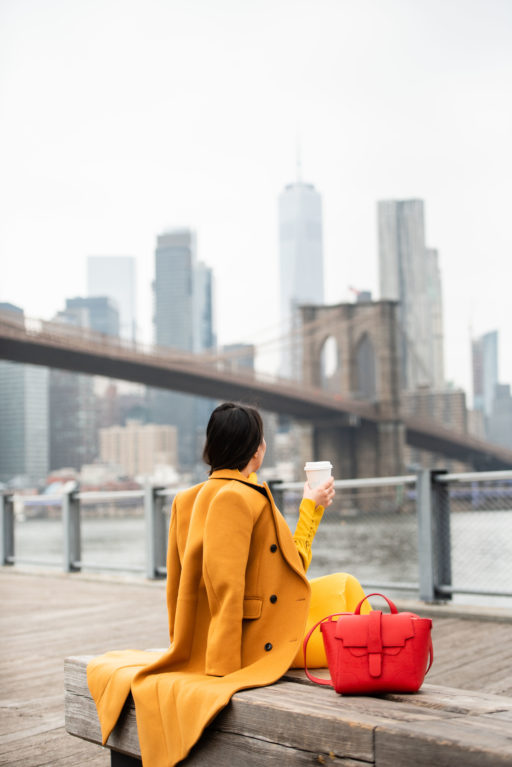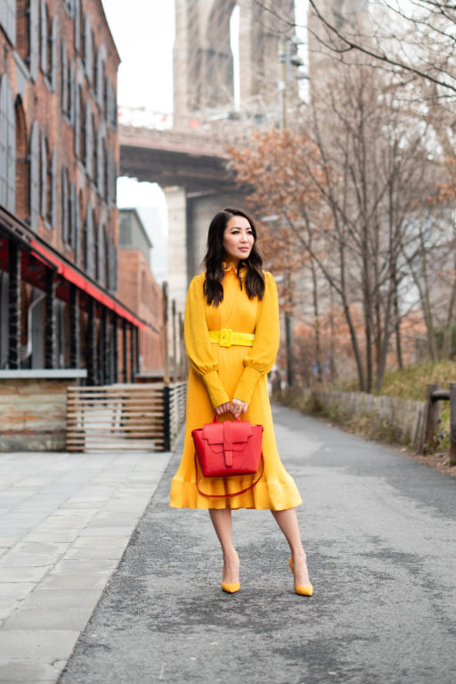 I think coat season is over (hopefully I’m not speaking too soon!). In the last few days, the weather has been beautiful and warm. Before putting my coats away, I wanted to create one last color arrangement to celebrate the end of winter. Layering my Ann Taylor puff sleeve blouse under an old Tibi dress and anchoring the look with a dash of red with my Senreve bag (color Mimosa Chili), I revisited one of my favorites – sunset colors.