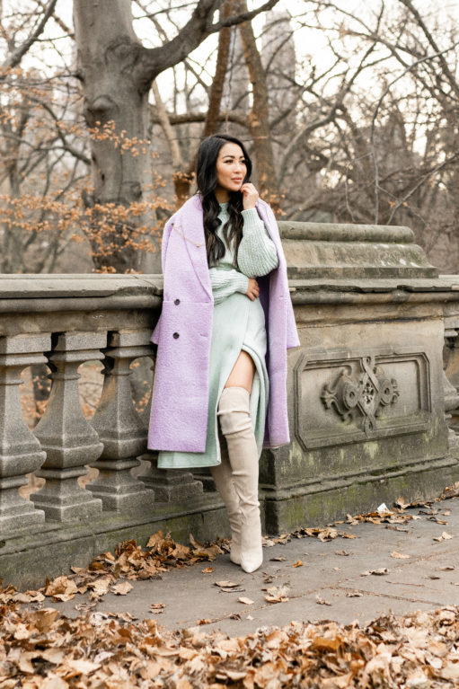 Last but not least, a pastel combination of lavender and mint. I love this color pairing! It’s fresh, soft and joyful. Keeping these two colors as the main color story, I look to neutral colors such as beige, nude, or brown to complete the look. Nude, beige, or tan boots. And same with a bag. Accessories that would not take away from the principle color palette.