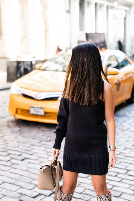 From the mini length to the puff sleeve to the asymmetrical neckline, this sweater dress is perfect for spring! Especially when the temperature is not quite warm yet. I love it with snakeskin boots for a city look and with sneakers for a comfy weekend style.