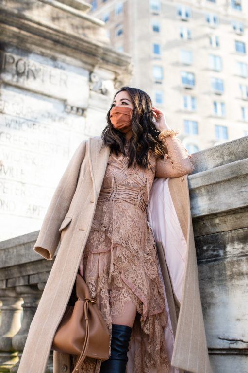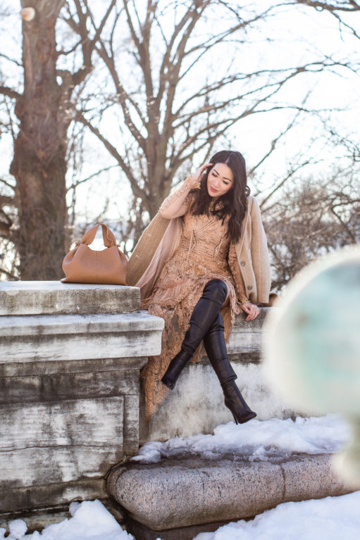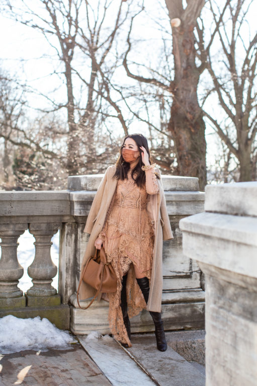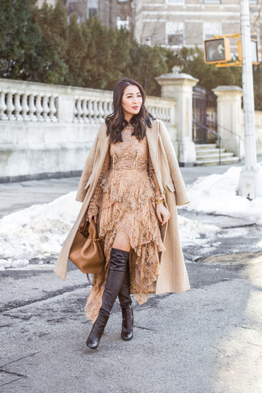 Today, we’re dressing up this coat (and I’ll restyle it again for a casual look soon) with lace in beige color stories to create a tonal look. Rounding out the look, I paired it with a deeper camel color with the bag.