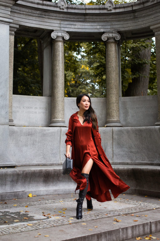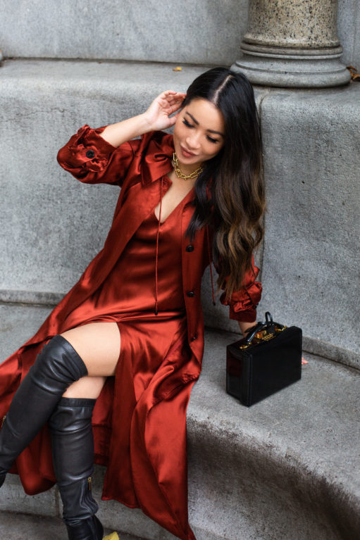 When I first saw this silk set, I didn’t realize it was loungewear. I thought it was a silk dress and trench. After doing a little research, I realized that designer Jacques is a master of inside out – creating beautiful loungewear pieces that make you feel glamorous at home and also for all outside the home adventures. Case in point, this coat trench and slip maxi dress! Balanced, luxurious, and perfect for day and night.
