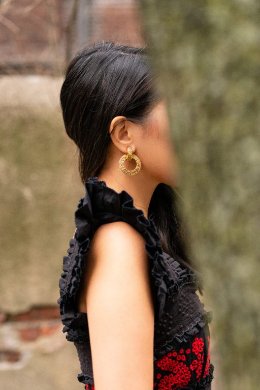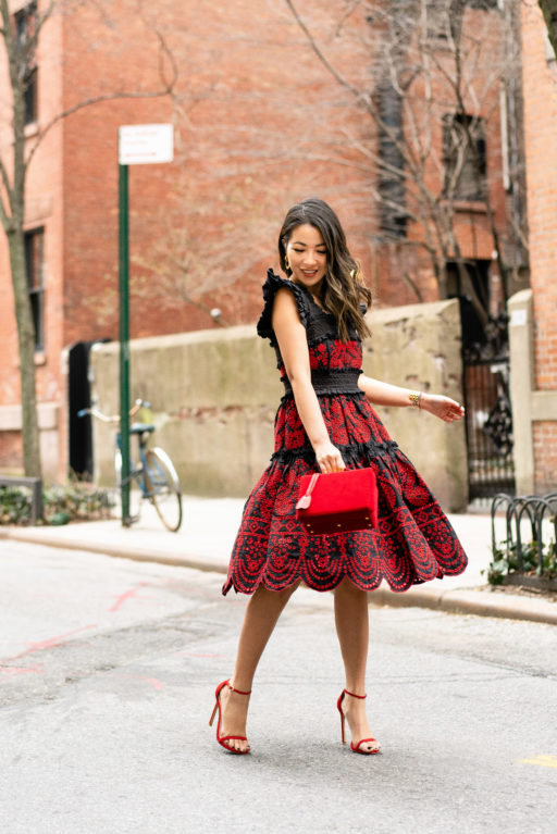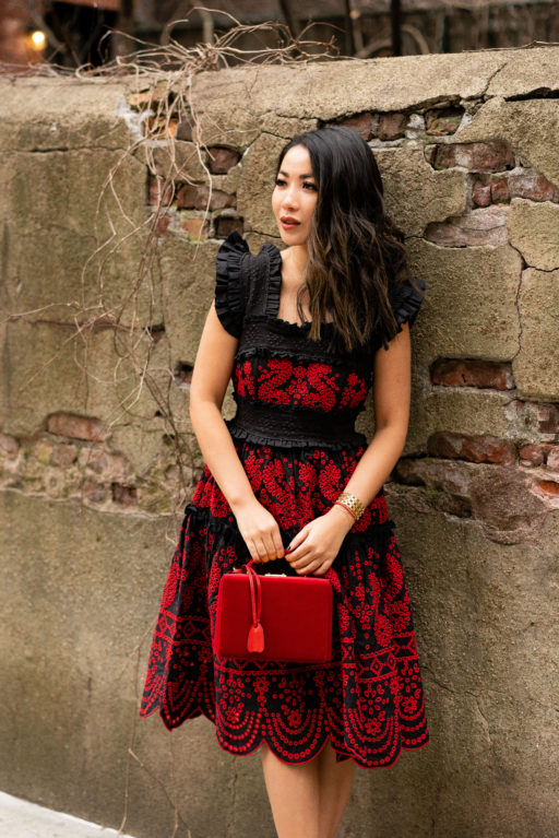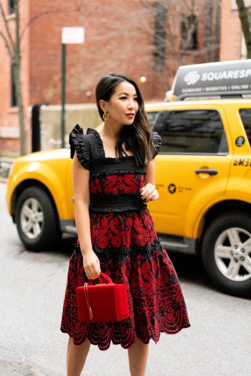 From the square ruffled neckline to the scalloped hemline to the beautiful embroidery, this midi number is so pretty in person. Pairing red with reds, I wore this on date night and got so many compliments!