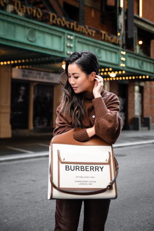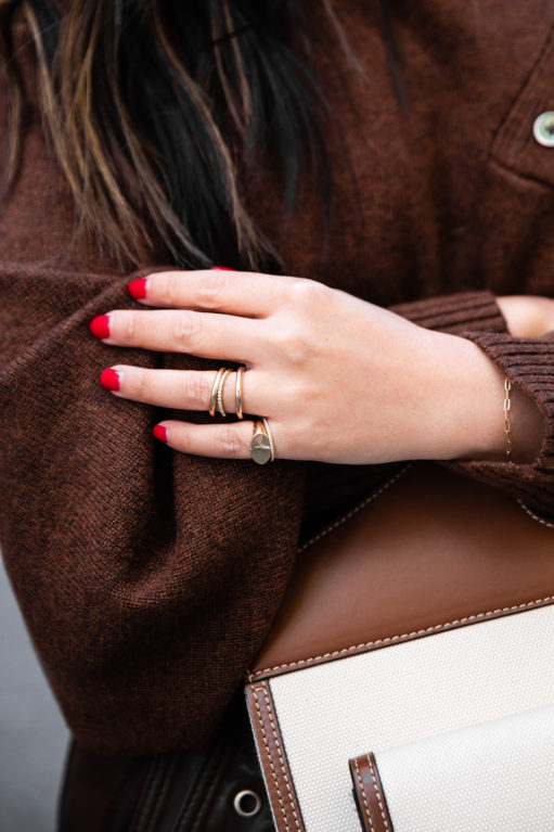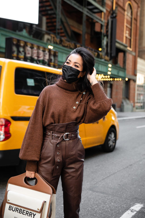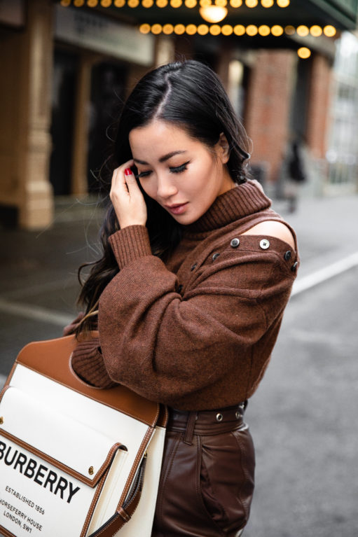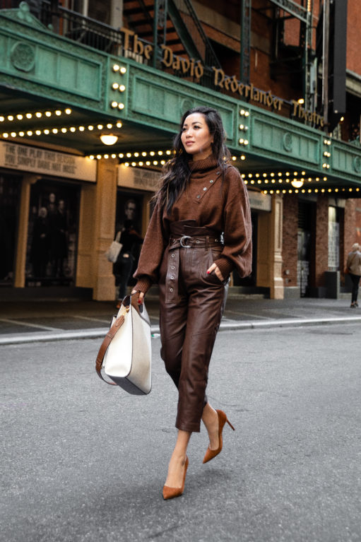 With autumn at our front door, sweater weather is a much welcomed tradition. In my humble opinion, one of the queens of fall styling is my dear friend, Marissa Webb. I have these leather pants in black and they are one of my absolute favorites. This chestnut edition is gorgeous as well and works beautifully with brown tones, winter whites, shades of blue, and more. And this sweater can be worn buttoned up or as a cut out detail at the shoulder. Super chic and cozy!