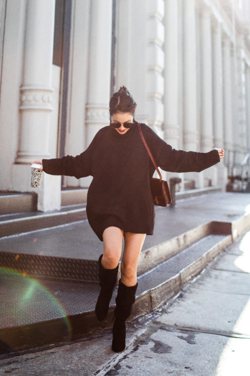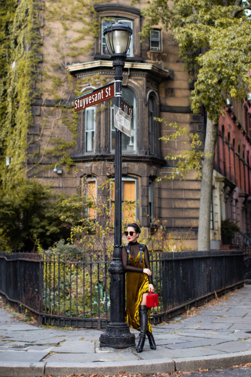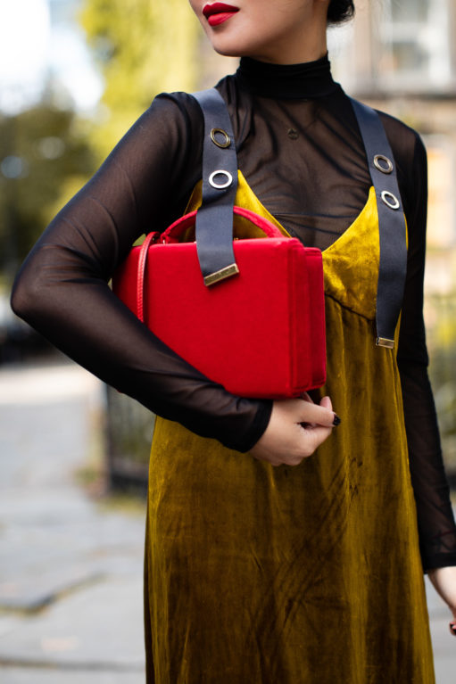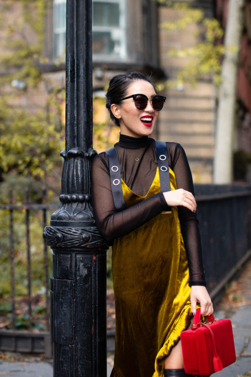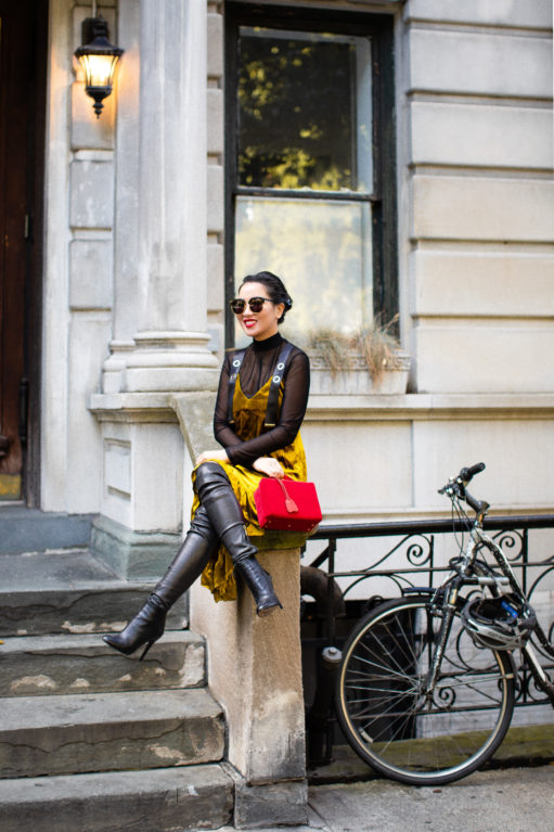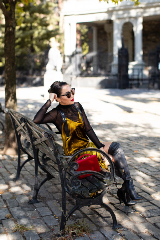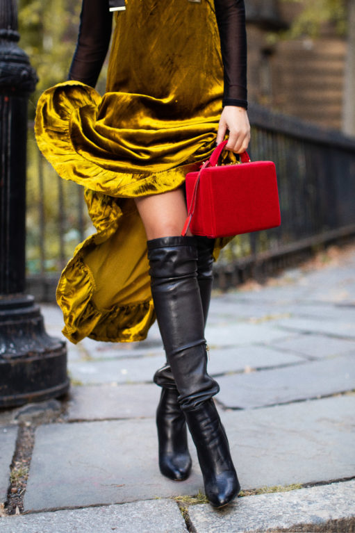 Velvet cakes, velvet dresses, velvet slippers… all equally delicious! This texture is sublime for fall. It’s soft, glimmers when the light touches it, and feels holiday ready. I love mixing velvet with stronger textures like leather (the tall boots), and pairing it with similar soft textures like sheer pieces (the turtleneck) and velvet accessories (the box bag). It’s the harmonious combination of feminine with masculine elements that I really love