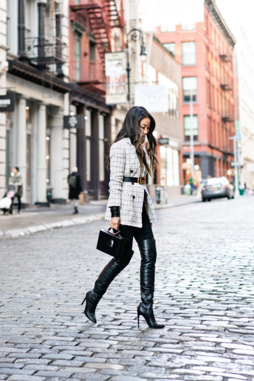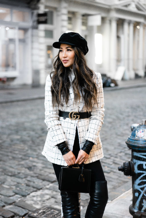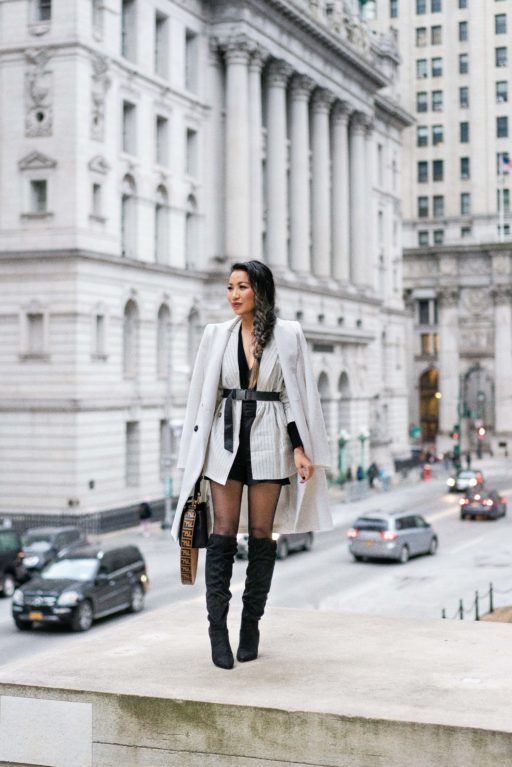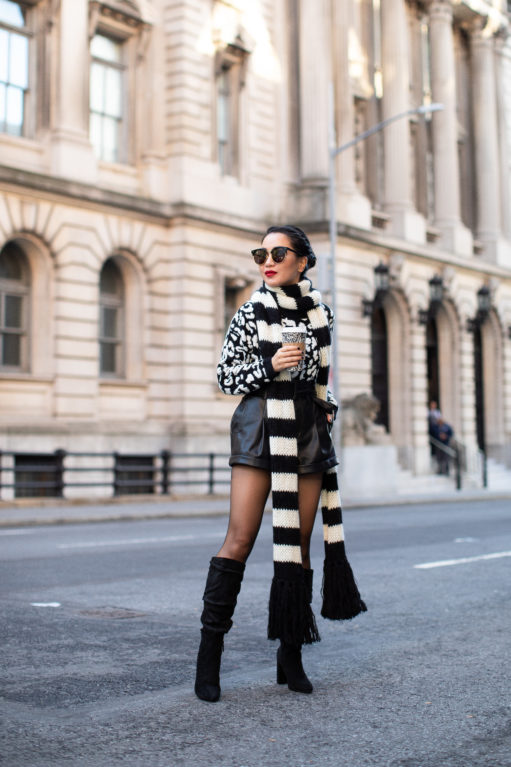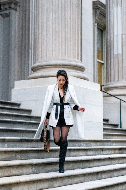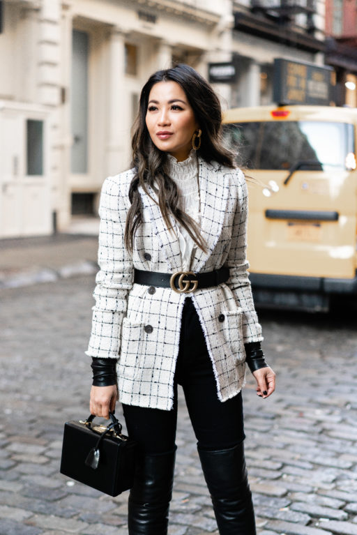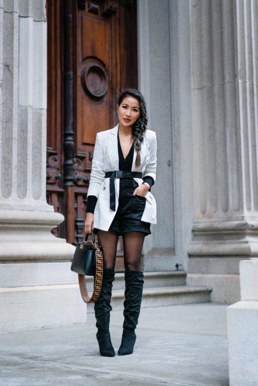 For NY winters, I have to practice the art of layering. And this blazer is perfect with a cozy sweater, wool coat, tights, and tall slouchy boots. Not to lose my shape with all of the layers, I belted the blazer using the buckle belt from the shorts.