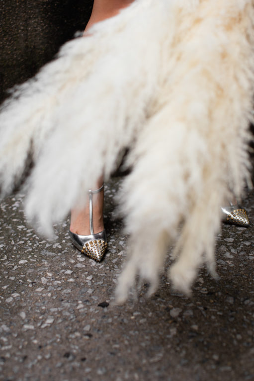 This pouch bag on rotation . It fits a lot, but can get heavy rather quickly. I’m used to lugging my heavy work bag around, so even when this pouch bag is full it’s on the lighter side for me. Pairing this bag and outfit with mirror accents, I love the spike studs and t-strap look of these silver pumps. I’ve worn these silver pumps before with jeans and a sweater, and really appreciate how metallic pumps can make a simple outfit instantly chic.